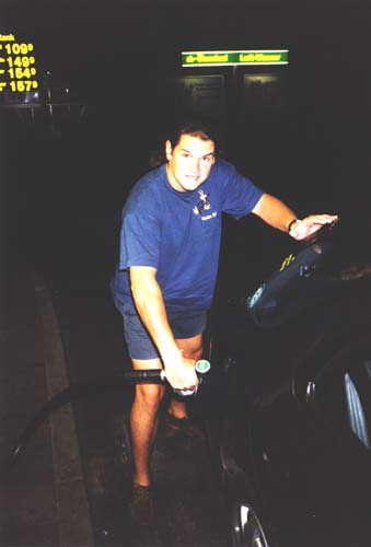 Florian mora um pouco fora de mão. Abastecemos o carro duas vezes antes de chegar lá. Aqui retrato a primeira vez, Florian ainda um pouco animado: